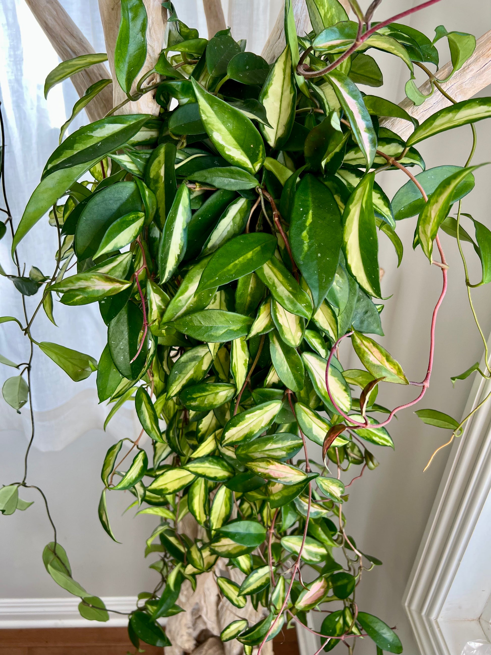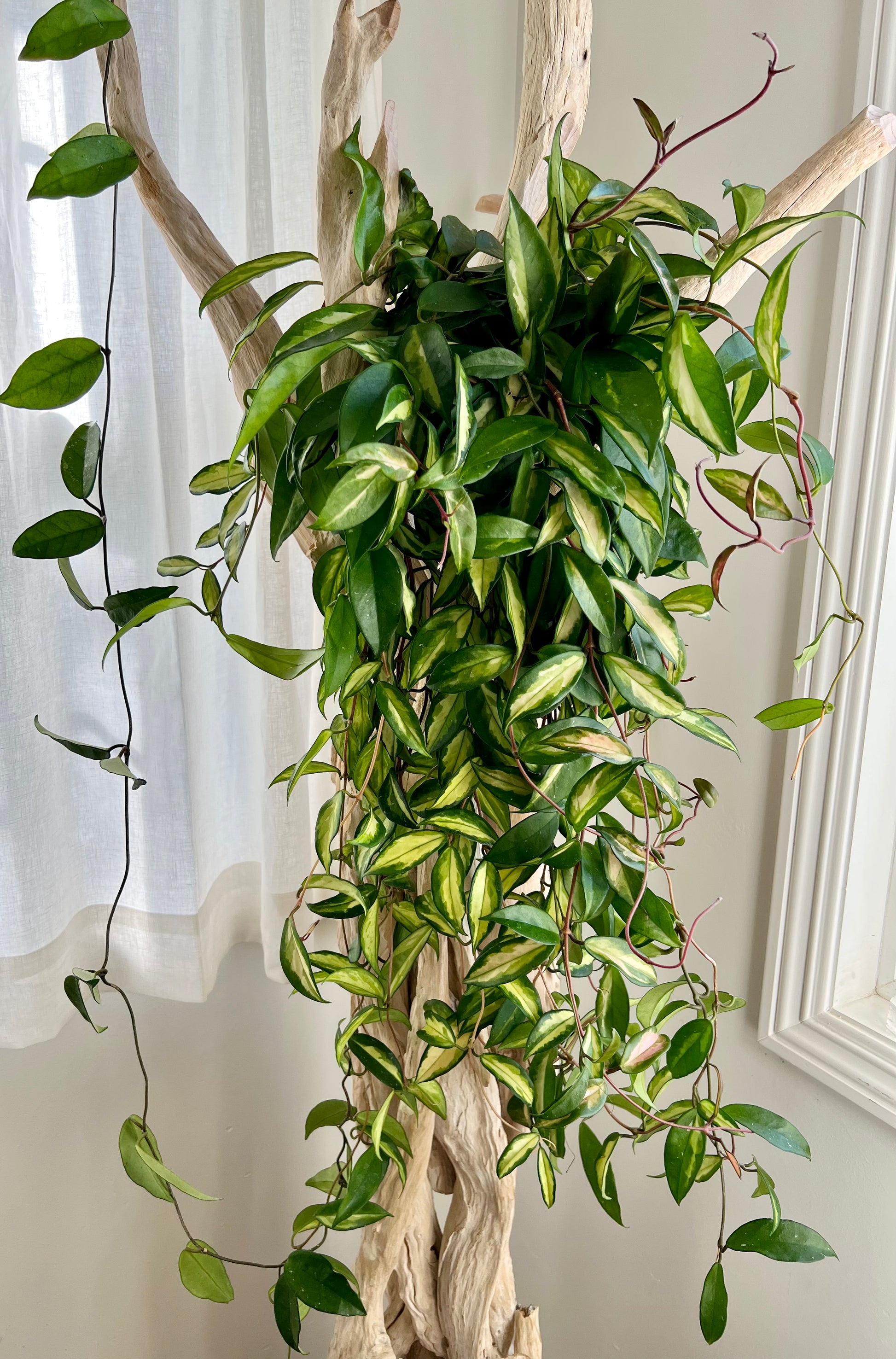 The Hoya Carnosa AKA Krimson Princess is back, baby! These beauties were very popular in the 70’s and 80’s and have made their way back in style (disco man emoji). This lucious plant is so fun to watch grow as it spits out variegated leaves on its glammed up pink stems. These princesses are one of the most low maintenance hoyas out there. They prefer bright indirect light. Direct sunlight during winter and spring can help encourage flowering. When soil feels dry to the touch it’s time to water this princess. Always thoroughly water your plants till water comes pouring out the drainage holes. Take advantage of the TLC put into these lovely princesses as they are already very mature and ready to give your place a new statement piece.